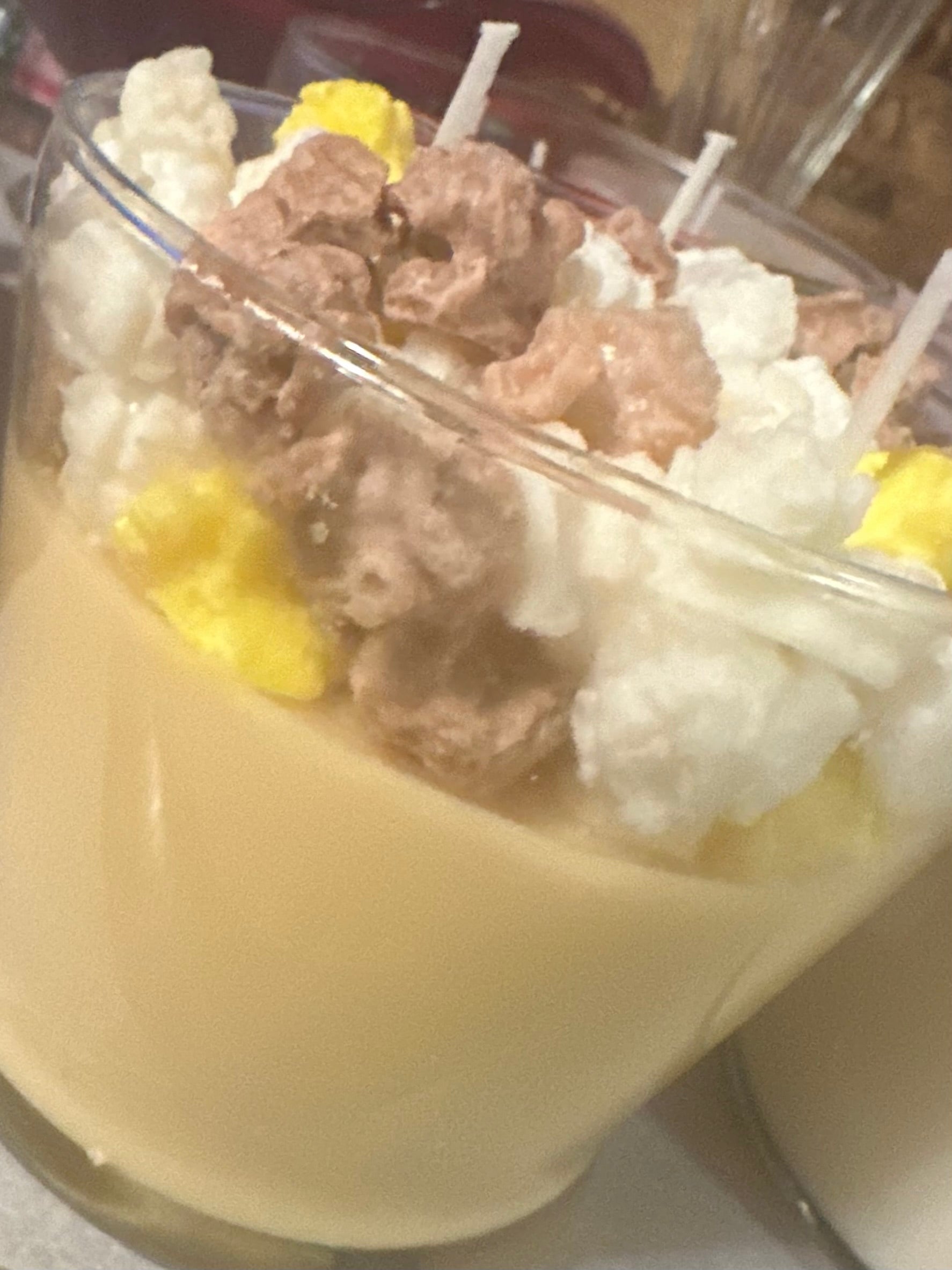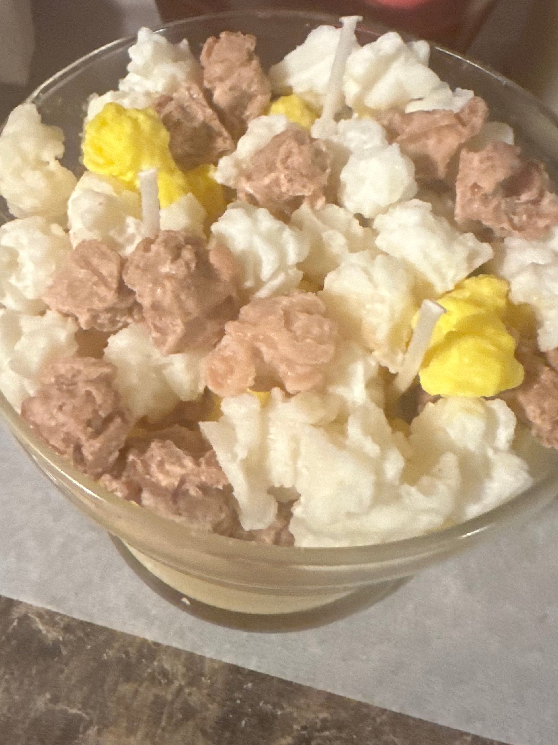 18 ounce soy candle decorated with Beas wax popcorn. The base of the candle is scented with a Carmel popcorn candle scent mixed with all natural soy wax
